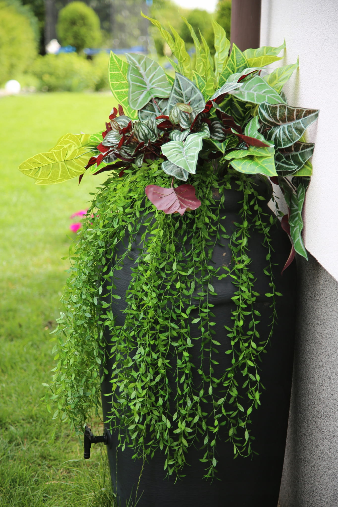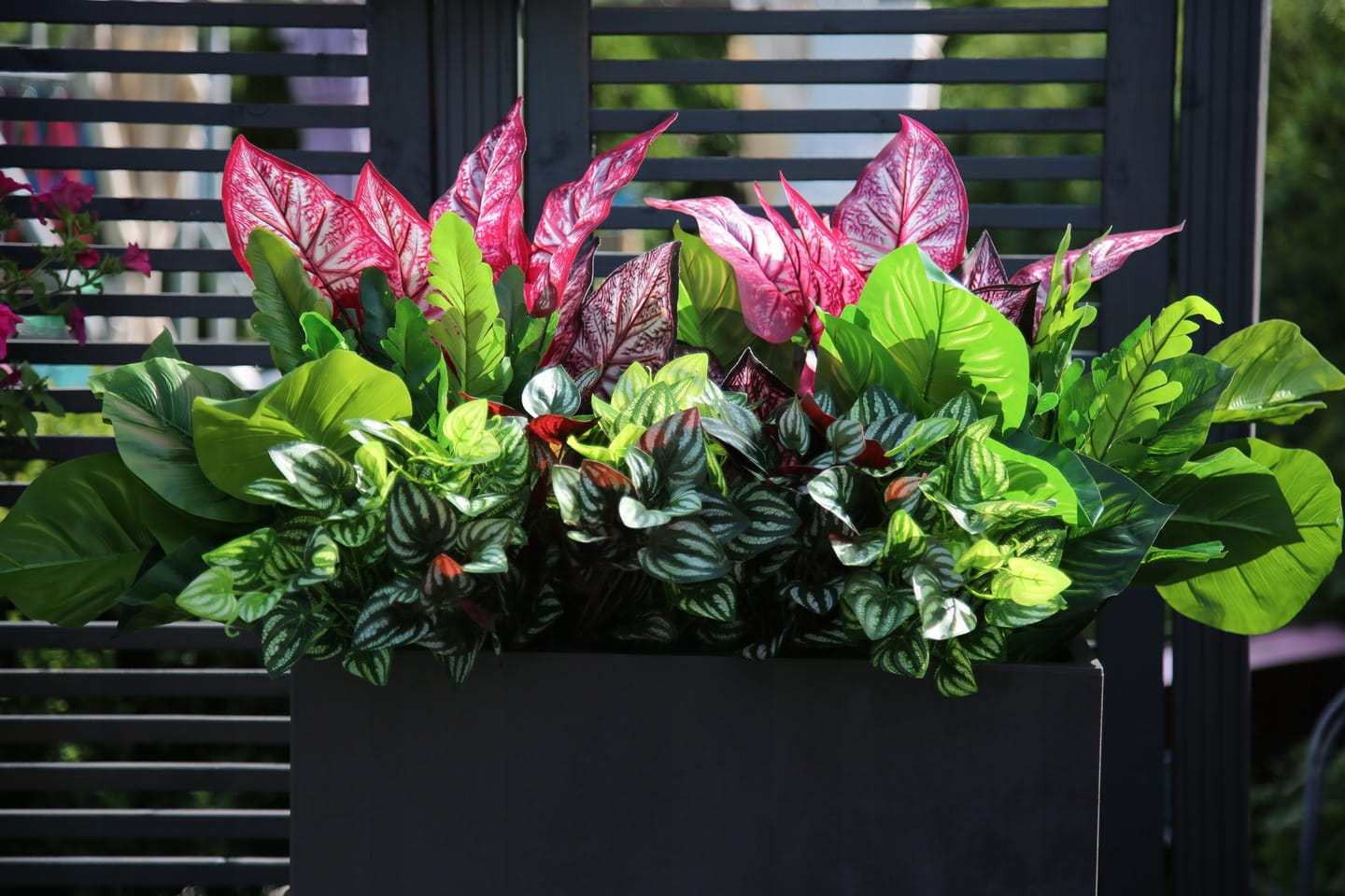 Piękna dekoracja balkonów, tarasów, parapetów, do złudzenia przypominająca naturalne rośliny. Sztuczna kompozycja sprawdzi się wszędzie tam, gdzie rośliny żywe nie mają warunków do wzrostu lub ich właściciel nie ma czasu na pielęgnację.
