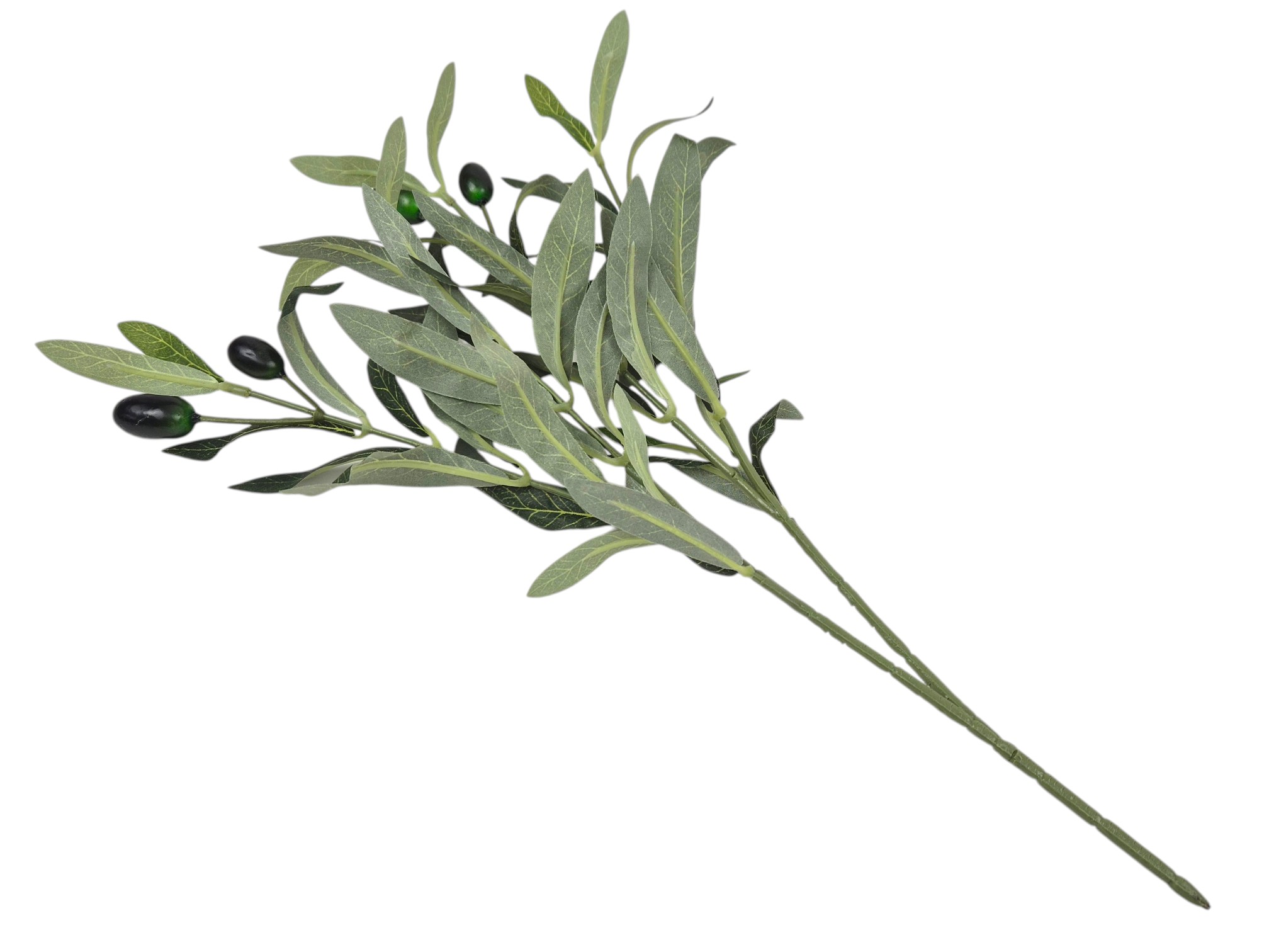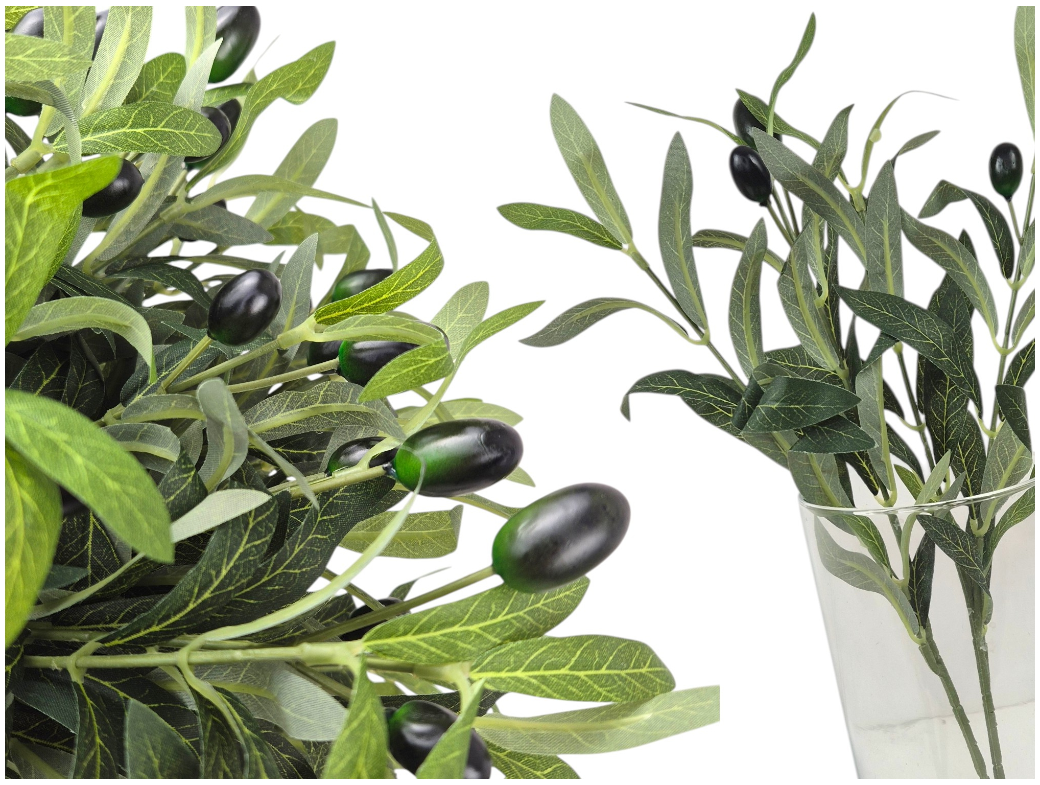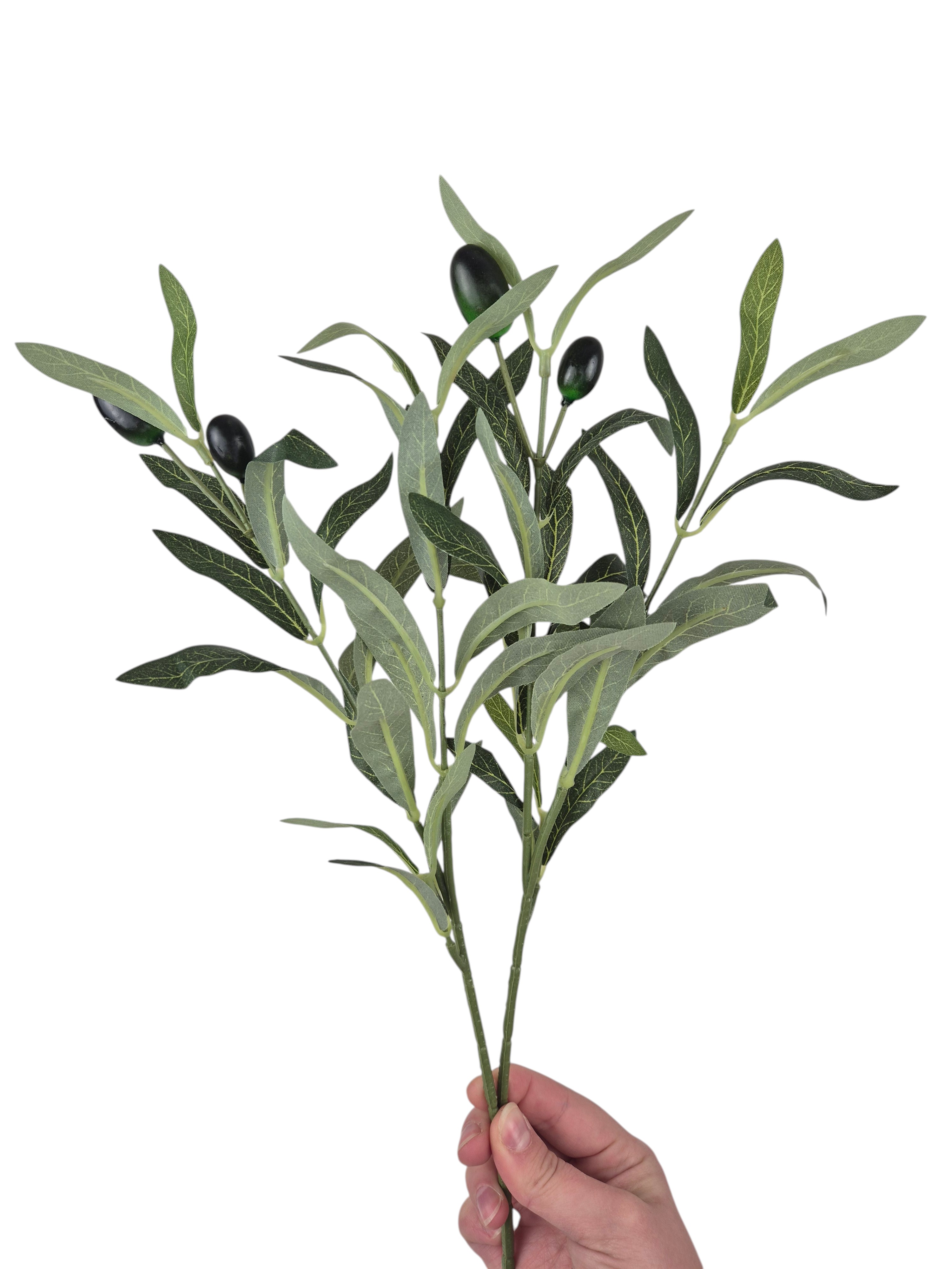 Gałązkę sprzedajemy w pojedynczych bukietach, 2 rozgałęzienia, każde z 2 owocami oliwki w kolorze czarnym i lekko zielonym. Na zdjęciach kompozycja kilku sztuk.