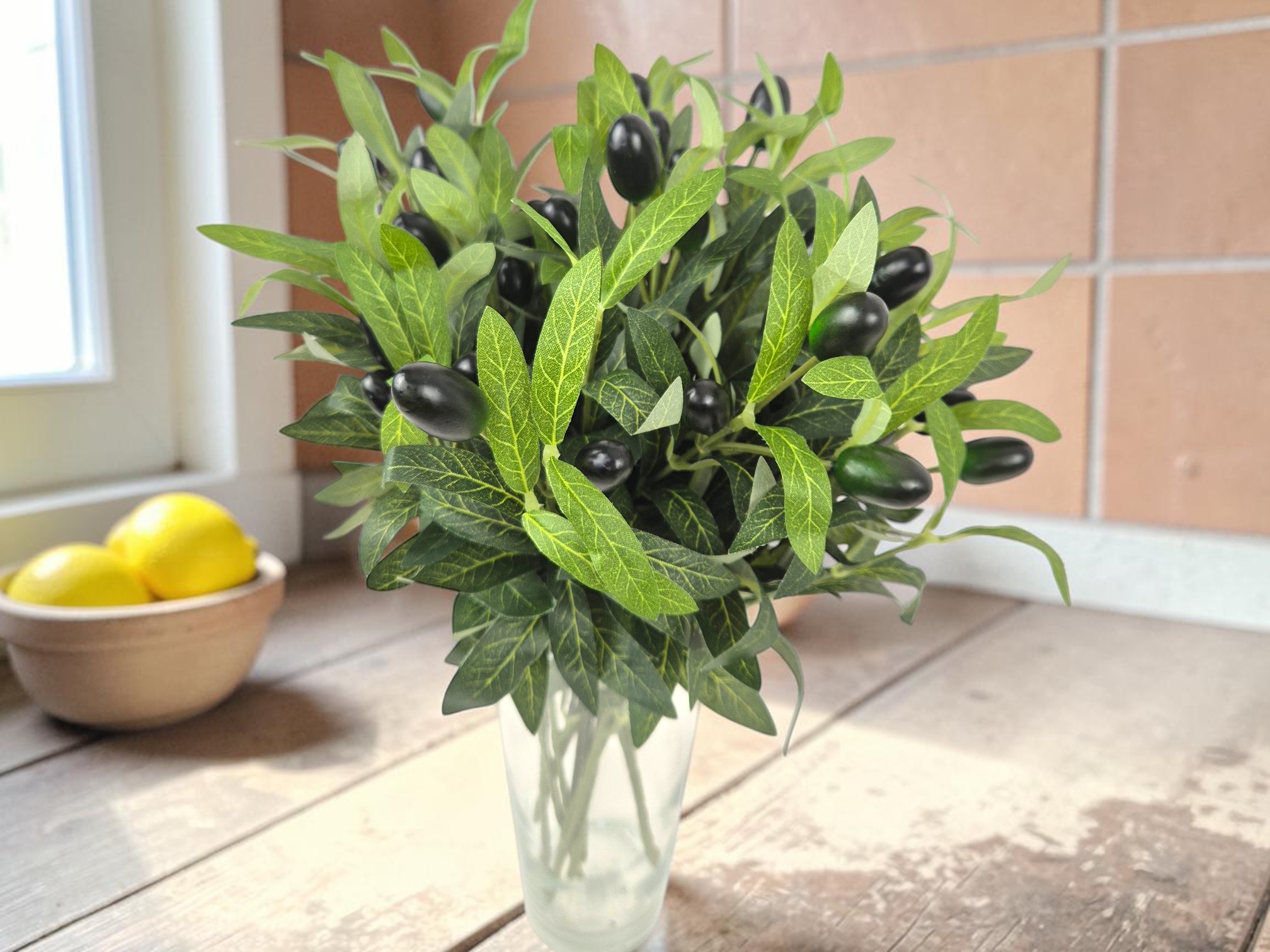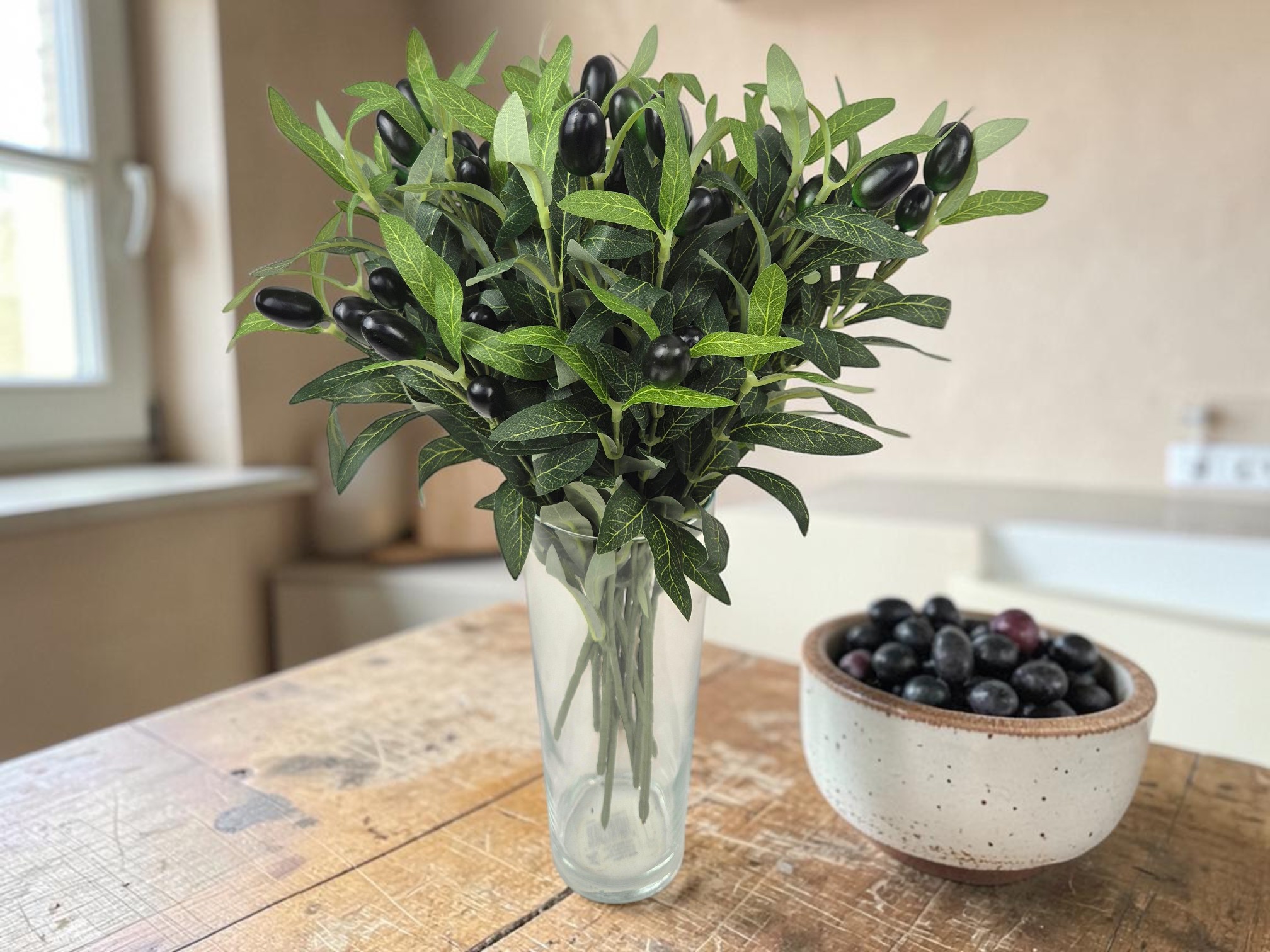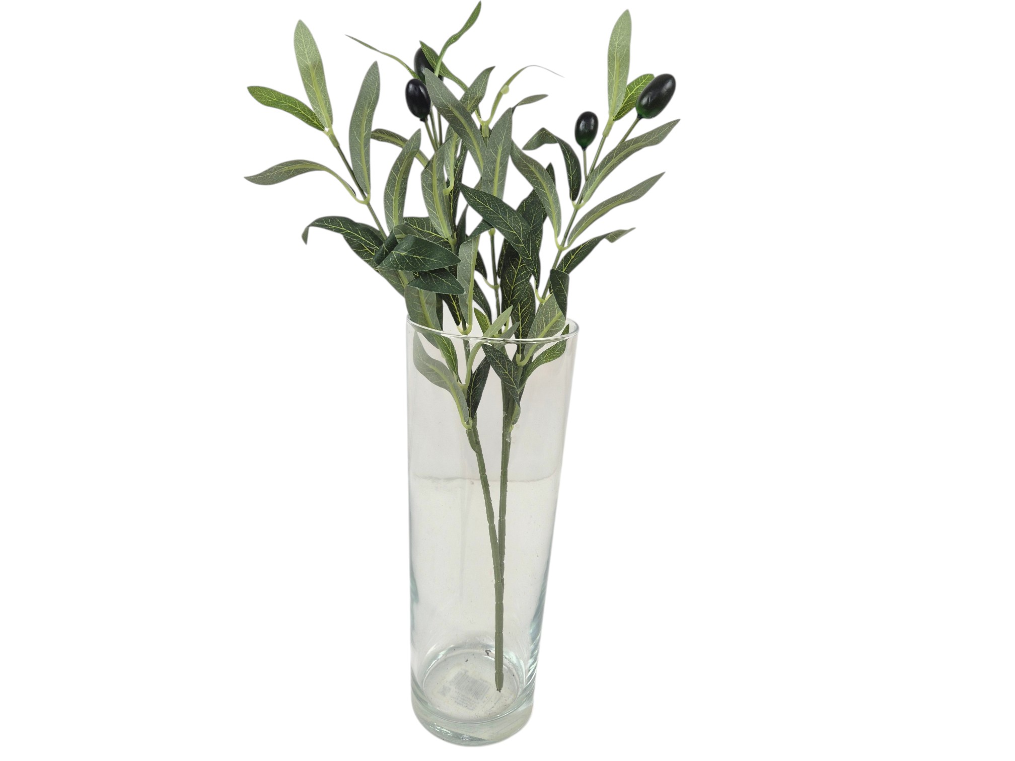 Gałązkę sprzedajemy w pojedynczych bukietach, 2 rozgałęzienia, każde z 2 owocami oliwki w kolorze czarnym i lekko zielonym. Na zdjęciach kompozycja kilku sztuk.